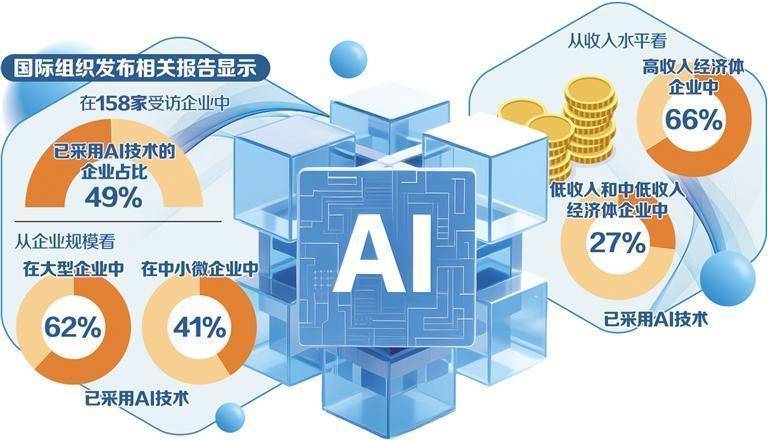 在158家受访企业中,49%的企业已采用AI技术,并已将该技术嵌入企业实际运营阶段。在采用AI技术的企业中,高达79%的企业从事国际贸易活动,这说明AI与贸易活动高度相关。同时,报告发现,AI应用在企业规模、收入水平和行业之间存在系统性差距。