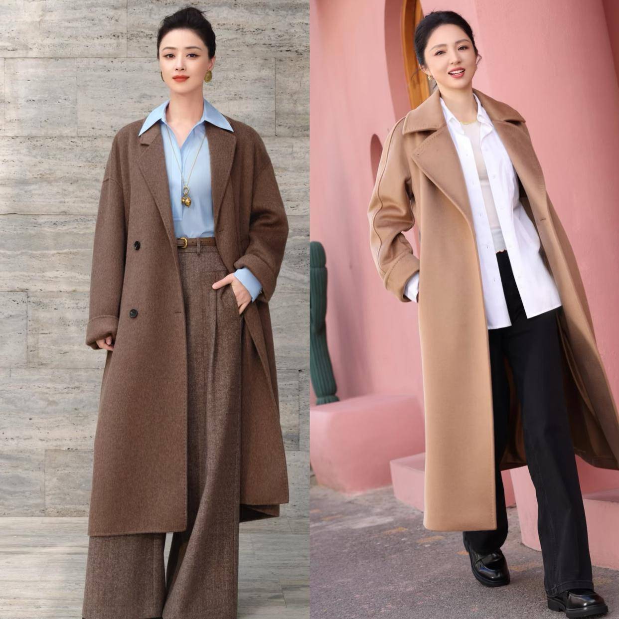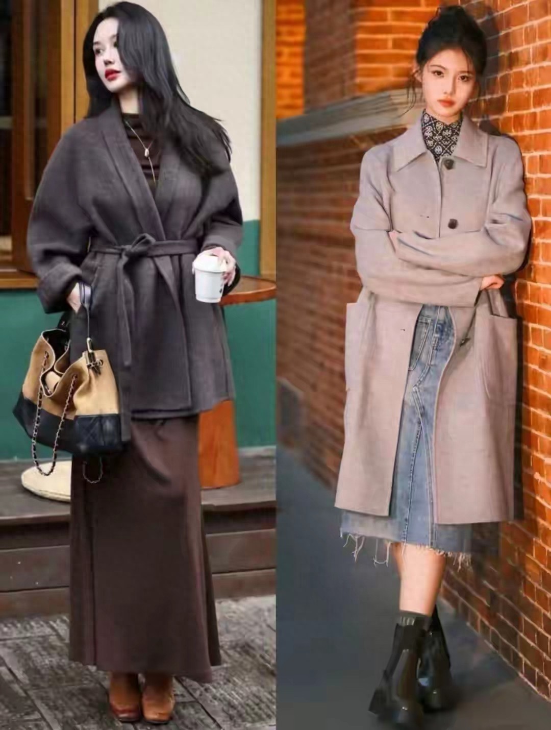 反观左边的这一件灰色大衣外套,面料挺阔,有型比较有光泽感,而且上身效果比较修身,使得穿搭者身材更挺拔,这就是贵衣服的区别所在。