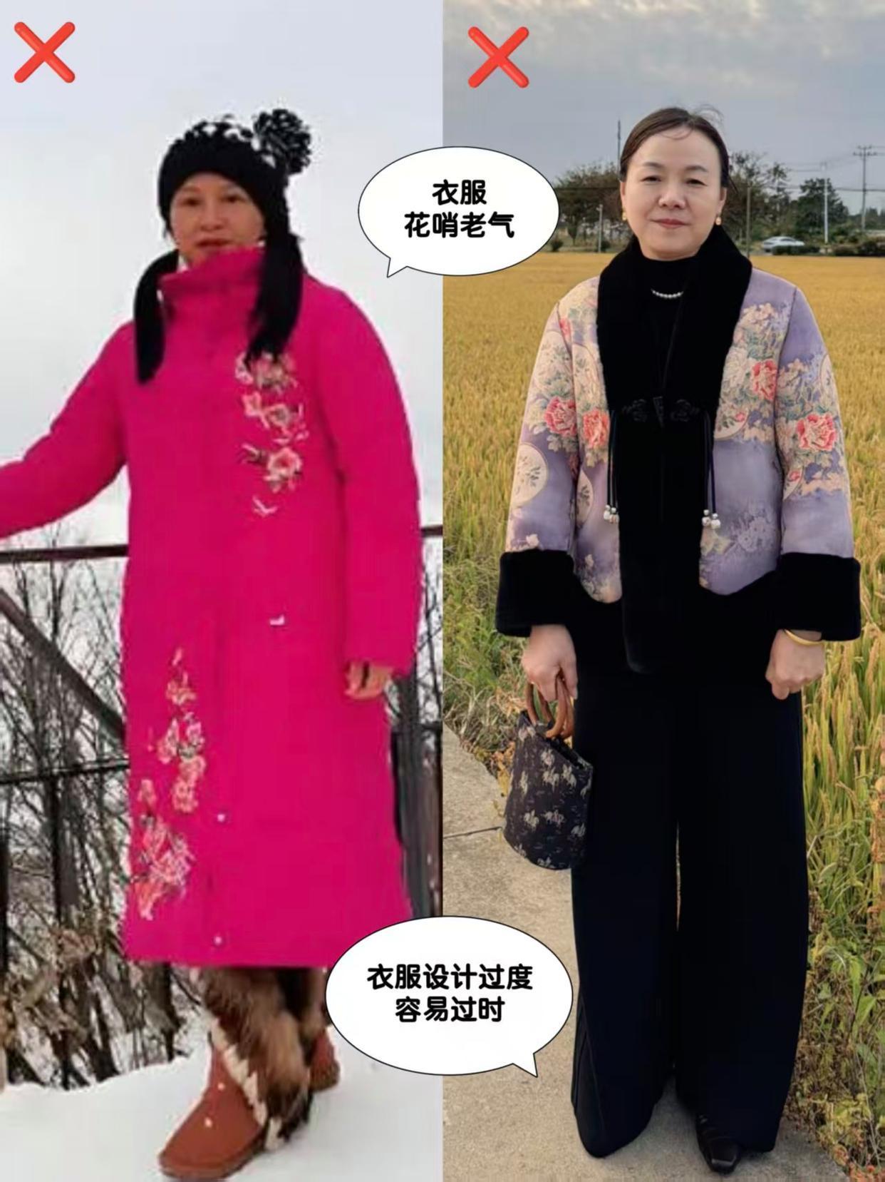 中年女性更不能穿花哨的衣服,也不能穿像上面这种粉红色的印花羽绒服,衣服设计过度容易过时,穿在身上显土显廉价。