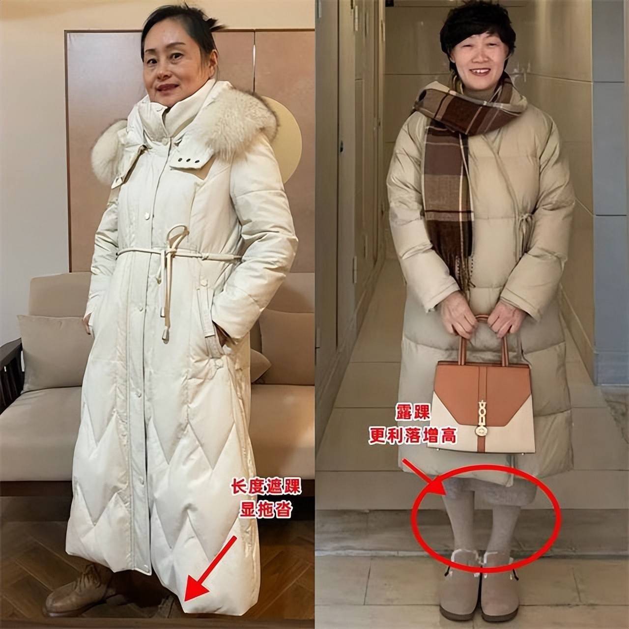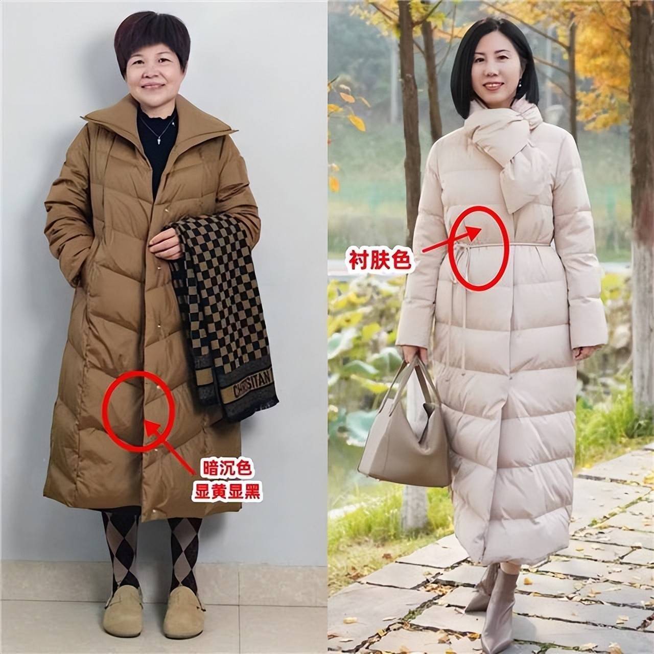 我们应该选择低饱和度,浅色系,纯色系的羽绒服来穿搭,例如上面这件浅杏色的长款羽绒服,上身效果就很衬肤色,使得穿搭者显白显嫩。