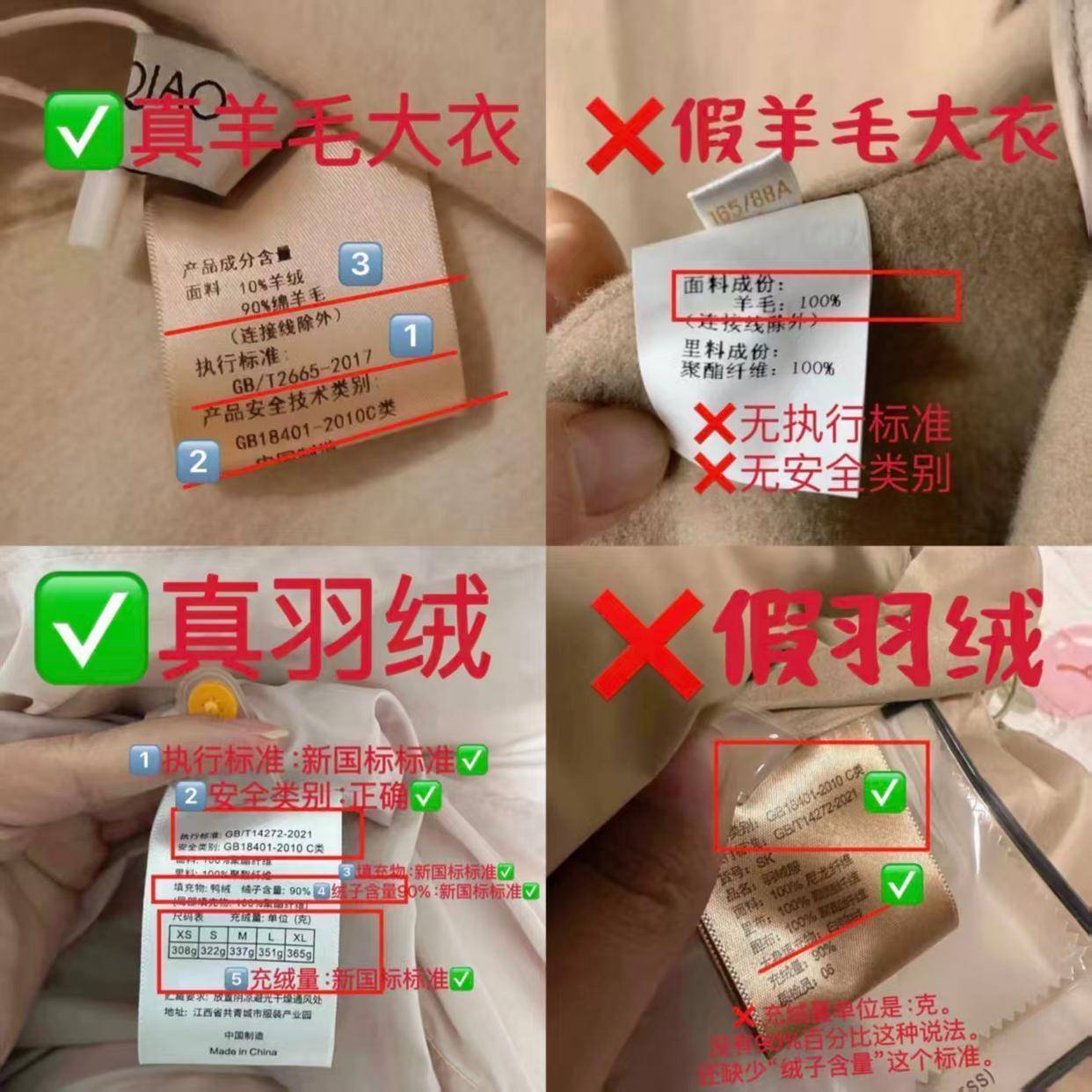 当然有的时候你可能花了大价钱买到的是一件假羊毛的大衣外套,商标上面写的100%的羊毛成分,这是假的。咱们再来看一下,真的羊毛大衣有10%是羊绒,90%是羊毛,当然,你还要看执行标准,还有产品安全技术类别,学会看这些细节,你才能买到好的衣服。