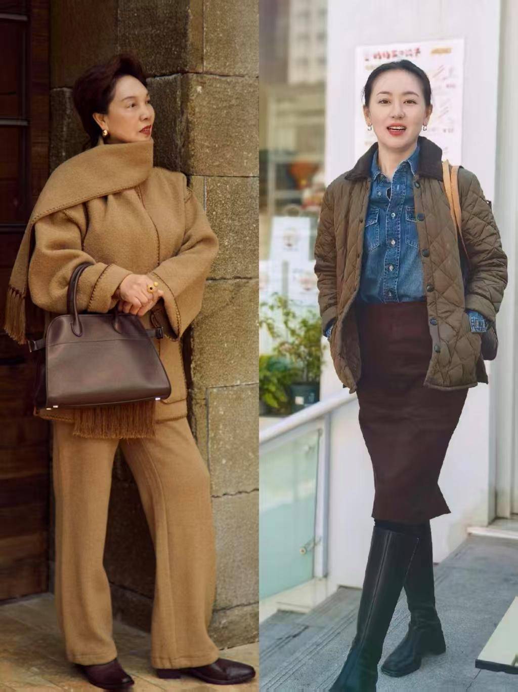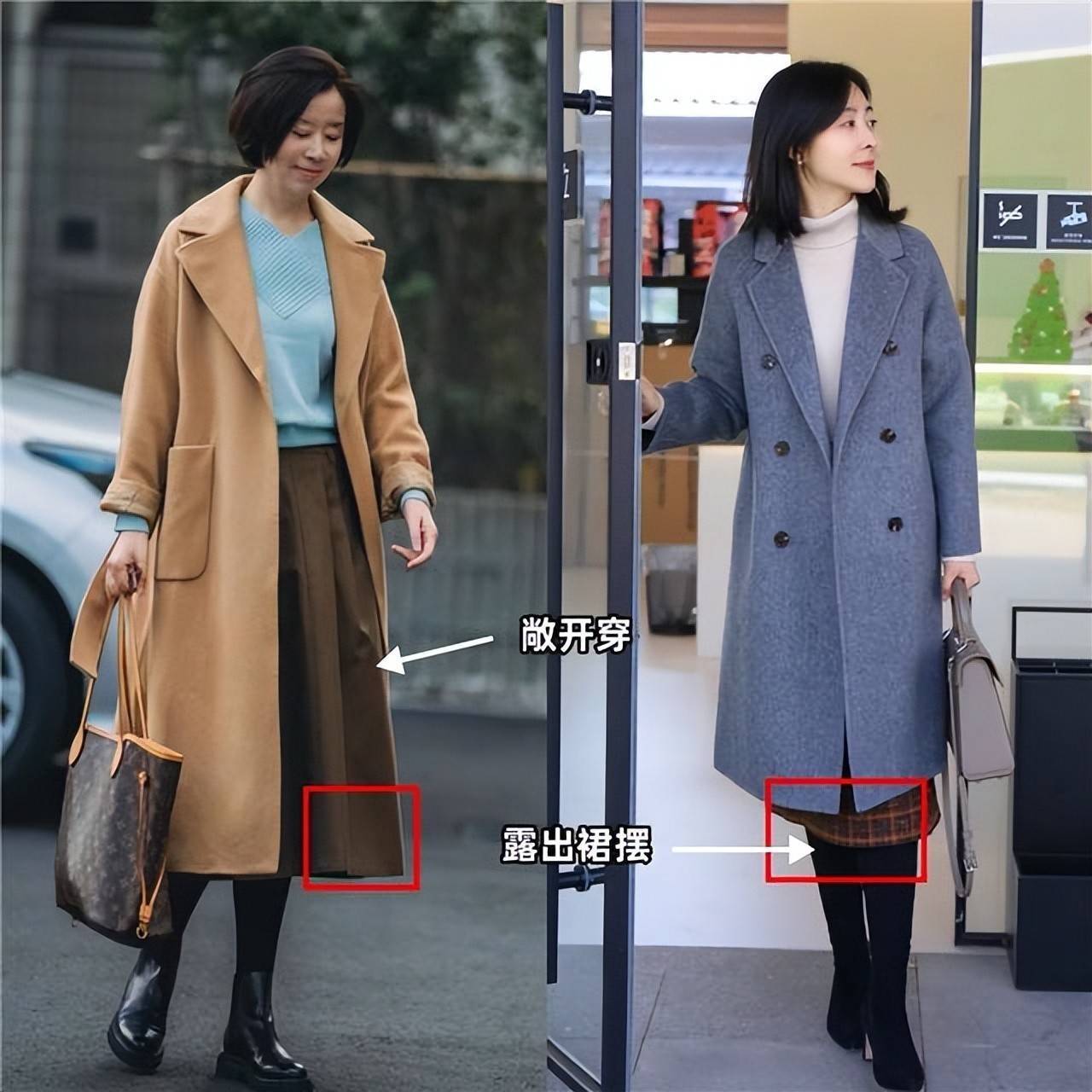 在这寒冷的冬天,不管是大衣还是羽绒服,选对版型和细节处理,咱们就能穿出优雅贵气感,例如上面这两位时尚达人选择的就是一件大衣外套,搭配上直筒半身裙,这样的造型简约干练又优雅。