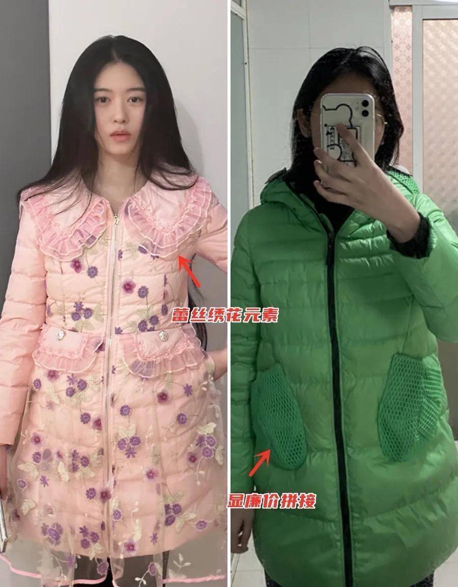 穿衣打扮最忌讳的就是选择印花的衣服来穿搭,那样很容易出错,更不要说还加上蕾丝绣花元素,在羽绒服上面,这就是所谓的画蛇添足,还不如直接试一件粉色的羽绒服。