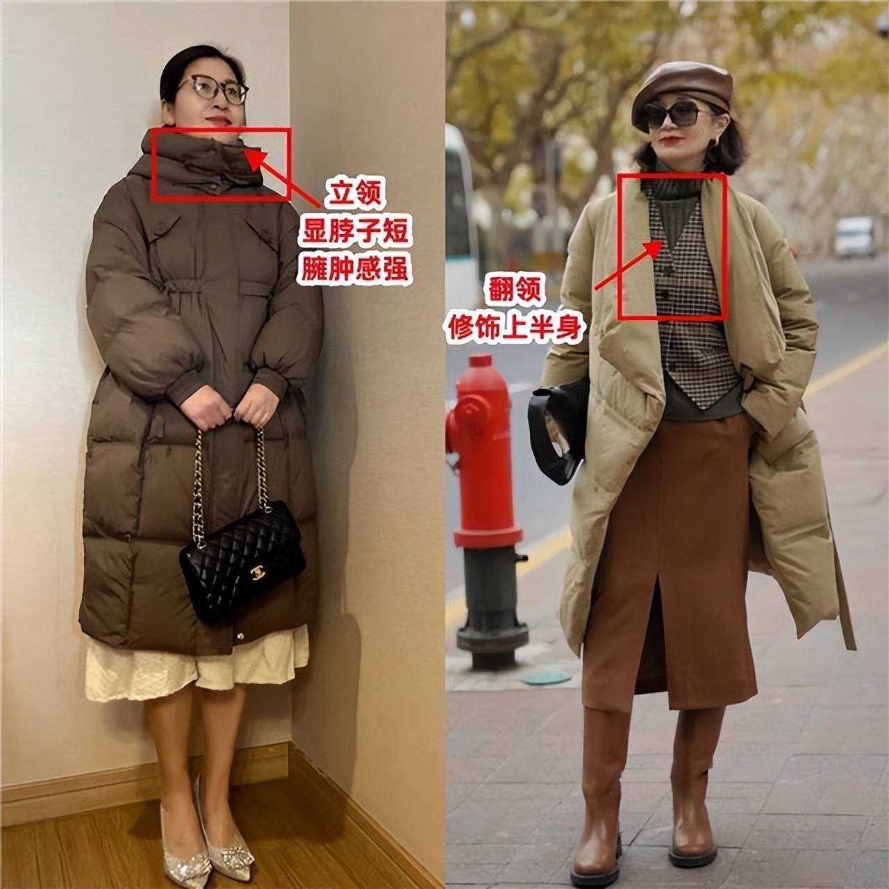 如果你的衣服款式选错,同样也会拉低穿搭者的档次,比如你选择的是立领的羽绒服外套,上身之后显脖子短,整体造型臃肿感比较强。