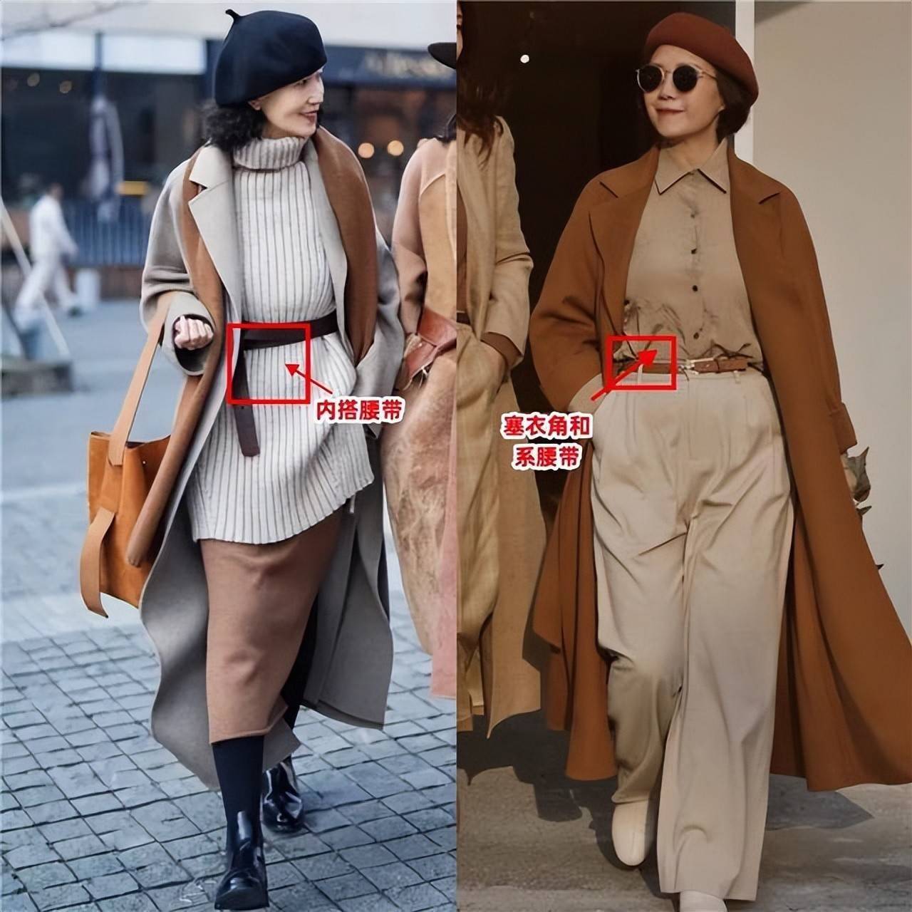 我们可以直接选那种高腰逍遥款的长款大衣,腰间自带腰带,穿的时候系起来就能很好的形成高腰线,又能勒出小蛮腰,一举两得,当然了,衣角长度正好卡在小腿肚位置最佳。