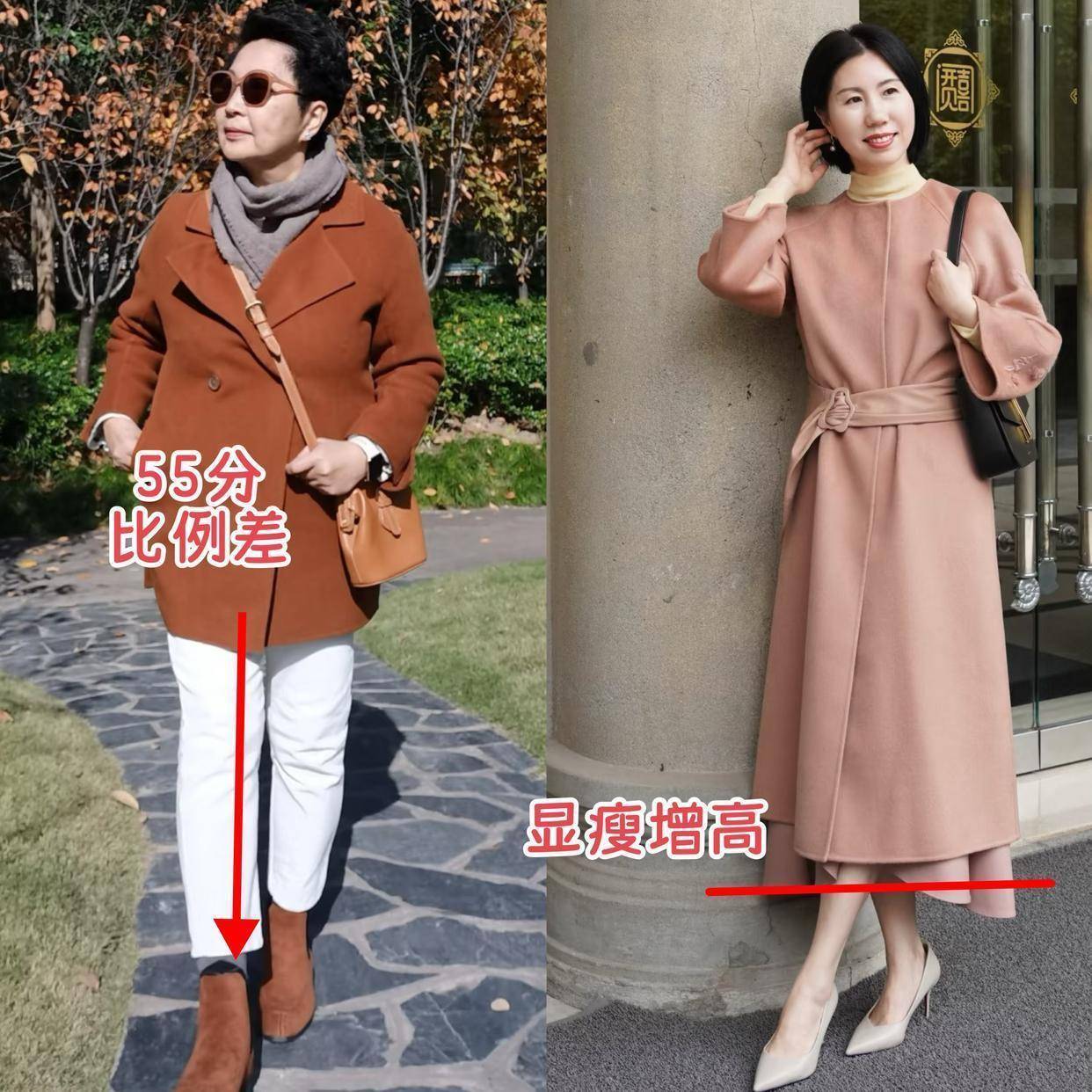 有的时候如果你的穿衣打扮不对,就会像上面左边的这位素人,用短大衣搭配白色9分裤脚穿短靴,这样的造型形成了五五分的身材比例,使得穿搭者显胖显矮。